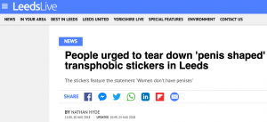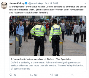 There seemed to be some sort of ambiguity about what exactly the police were investigating. The article celebrated the response of ‘dedicated activists’ who had decided to ‘fight back’ by putting up their own stickers bearing slogans such as ‘trans joy is real’ and ‘trans women are real women’. Were they to be investigated too?