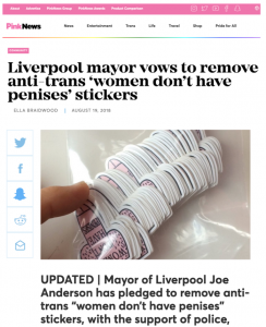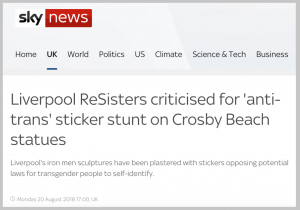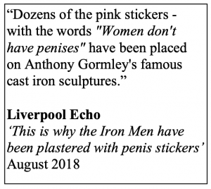 “The sculptures,” ran the article, “have been pasted with phallus-shaped stickers bearing the message ‘women don’t have penises’, by members of Liverpool ReSisters.