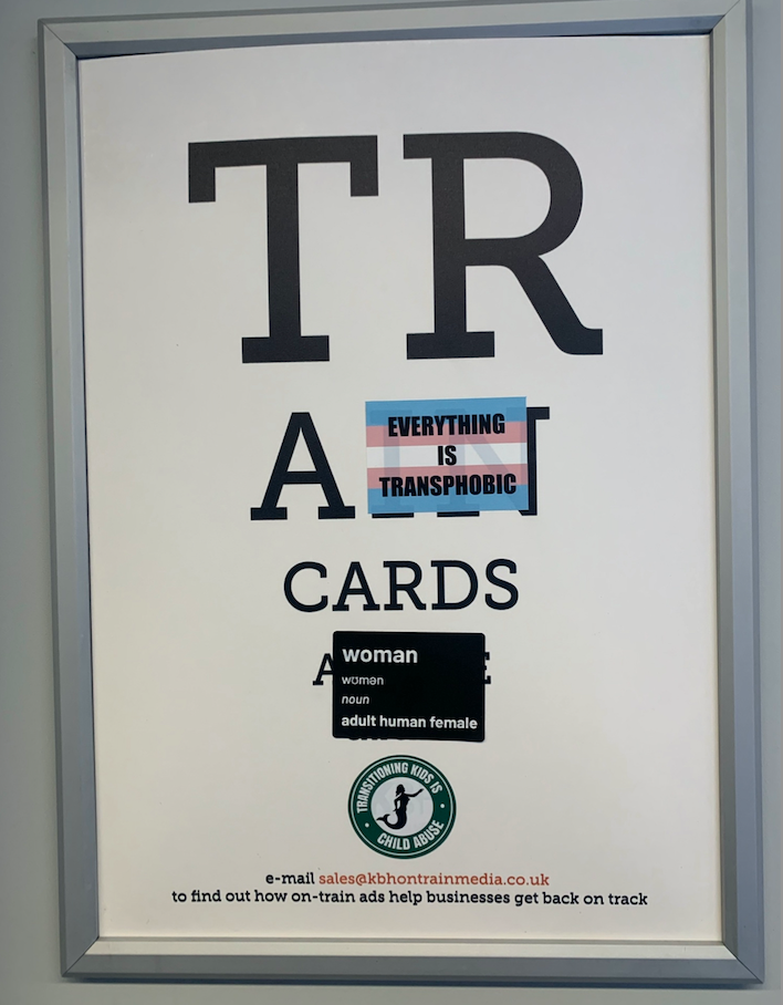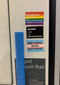One of my recent favourites, taken on a Kent train. Not a new sticker, but I’ve included it because it’s clever how stickerwoman has covered up the last letters of ‘trains’ to leave TRA (trans rights activist) showing next to the words ‘everything is transphobic’.