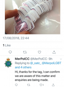 “He confirmed that the Transport police attended yesterday evening ‘looking for anti LGBT stickers’ in the toilets. Not only were there no razor blades they didn’t find any ‘anti LGBT’ stickers at all. All toilets were checked, men’s, women’s, disabled and staff.”
