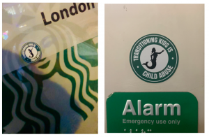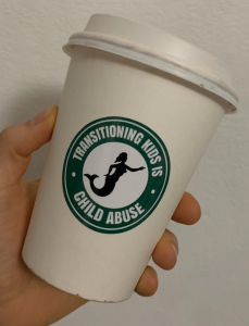 “Initially I researched cups,” Joyce told me. “I was going to make something that was like a Starbucks cup, or buy some cups and put stickers on them because getting cups printed up is really expensive. I was at one point considering making little cups with stickers on and standing outside Starbucks, giving them out, telling people Starbucks were giving away free samples today. You give someone a cup and it says ‘transitioning children is child abuse’ or whatever and they take it into the store … but I decided not to do that in the end. I just really wanted it to create a massive inconvenience for Starbucks and hopefully create a news story in itself.