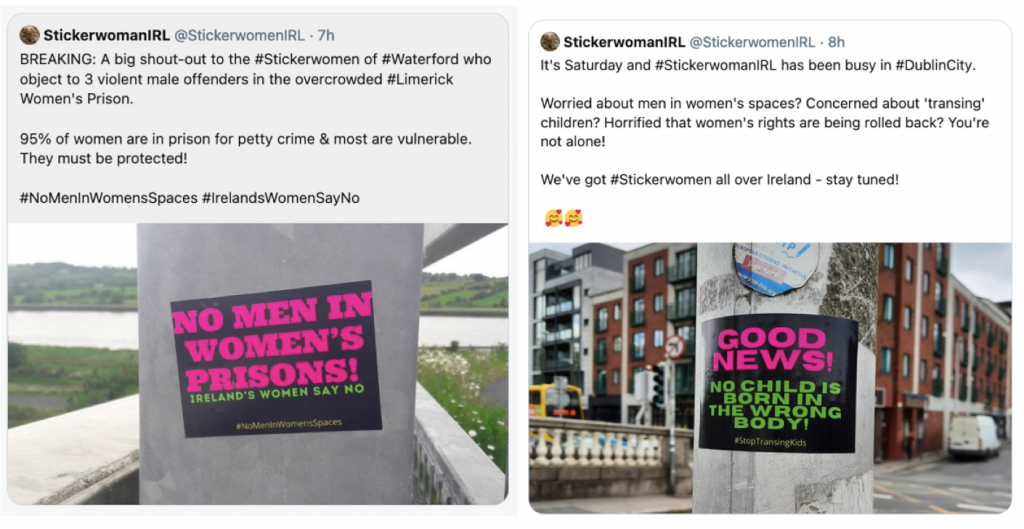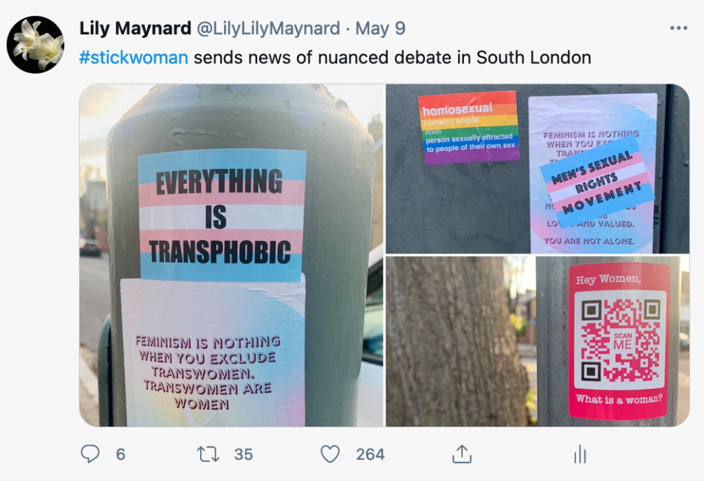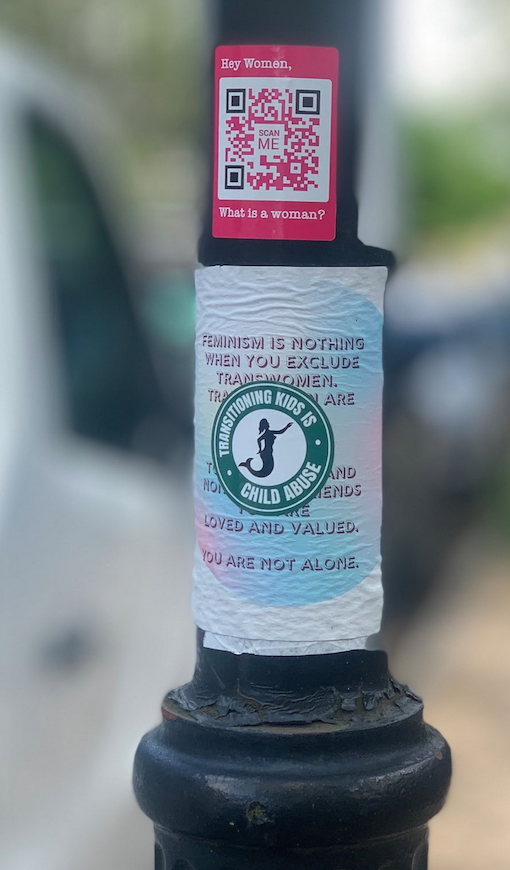 This is a sticker I haven’t seen before (right). It was sent to me by a stickerwoman so was obviously created ironically but may make passers by think about the IRL implications of self-ID.