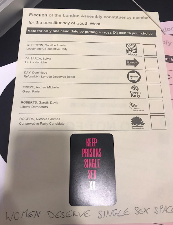 In recent elections for the London Assembly, Stickerwoman made no secret of her feelings, adding a sticker reading ‘keep prisons single sex’ and writing ‘women deserve single sex spaces’ on her paper.
