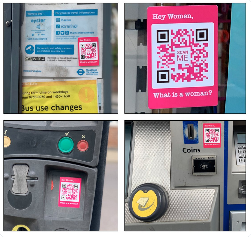 This response (left) includes Kellie-Jay’s latest inspiration: a bar code that can be scanned and takes you to the Standing for Women website. More of these have been spotted in central London.
