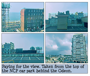 It took a surprising number of twists and turns to reach the top of the car park, and the view was not what we had expected. On one side rooftops; on two others the tawdry, grubby backs of buildings and from the fourth, through a gap in two large constructions, we could just glimpse the sea.