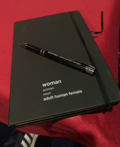 After finishing our coffee, we made our way into the venue, an actual cinema screening area. There was a bustle as speakers rustled papers, women- and some men- greeted each other. Standing for Women had a merch stall and I purchased a sheet of ‘adult human female stickers.