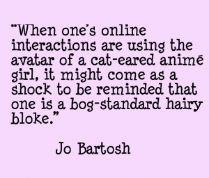 Bartosh observes that our identities are more and more frequently forged online. These ‘new, shaky, fractured, virtual selves’ are not anchored in reality and are often threatened by the slightest question. As such, mild challenges often lead to rape and death threats.