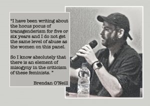 After thanking us for inviting him into our ‘coven’, Brendan spoke of his Catholic childhood and being expected to believe that the communion bread literally became the body of Christ. Rather than accepting this giant leap of faith, he said, he decided ‘this is bullshit‘ and he feels the same way about the idea that a person can somehow change sex.