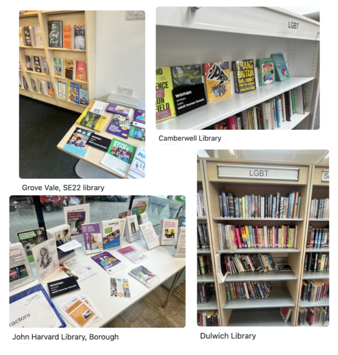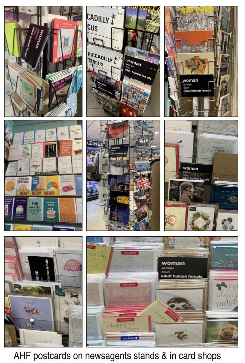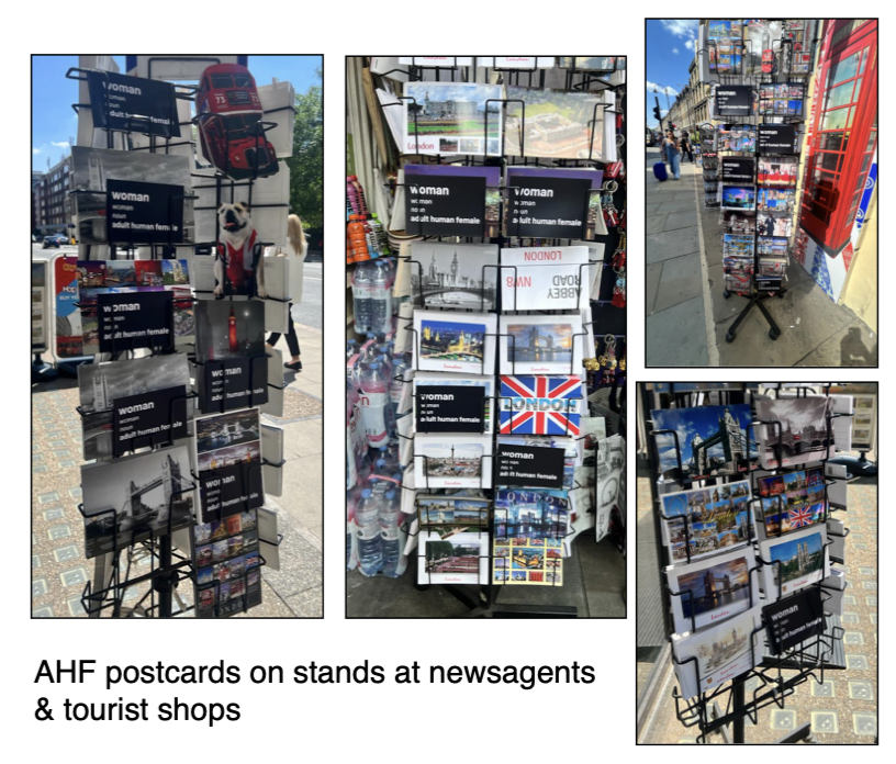 Their objective? To leave Adult Human Female postcards in as many of central London’s libraries, art galleries and museums as possible, taking in postcard stands and other opportunities along the way.