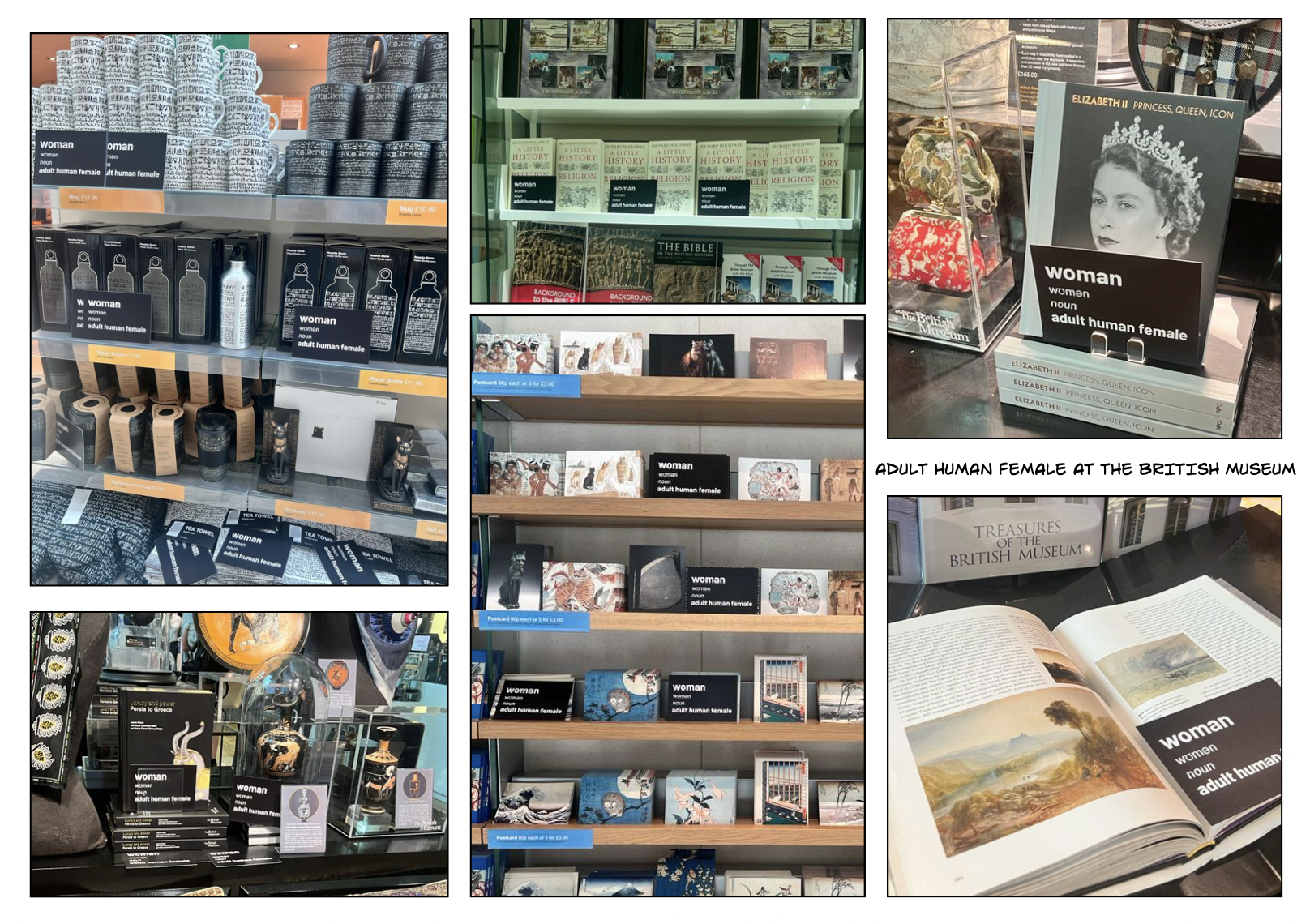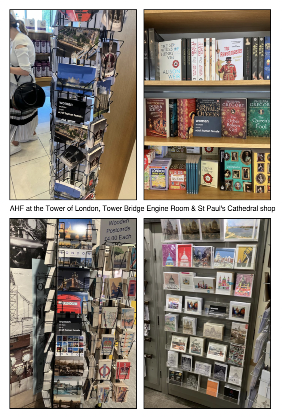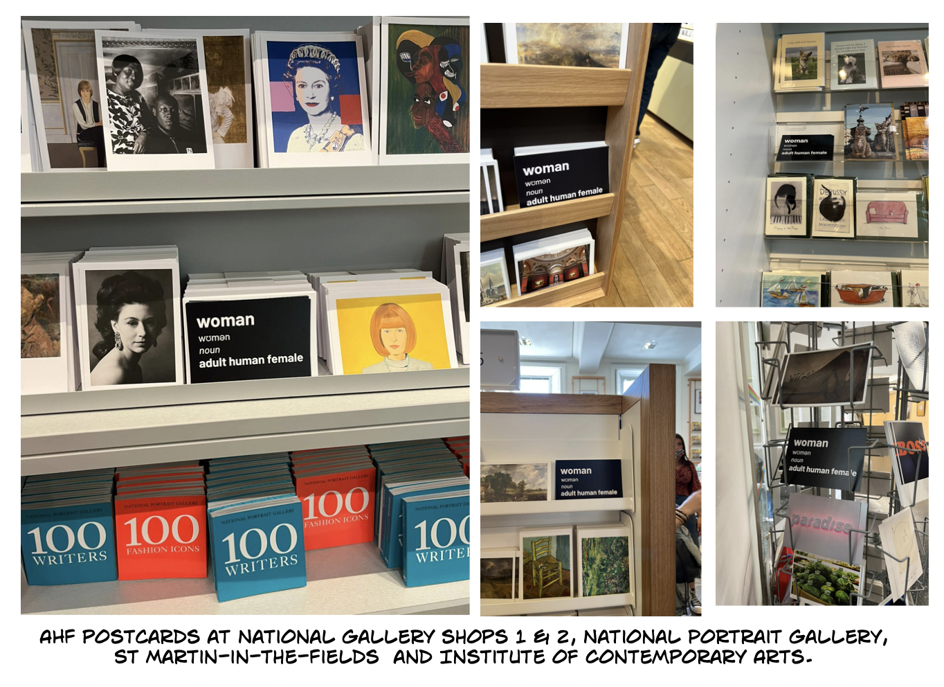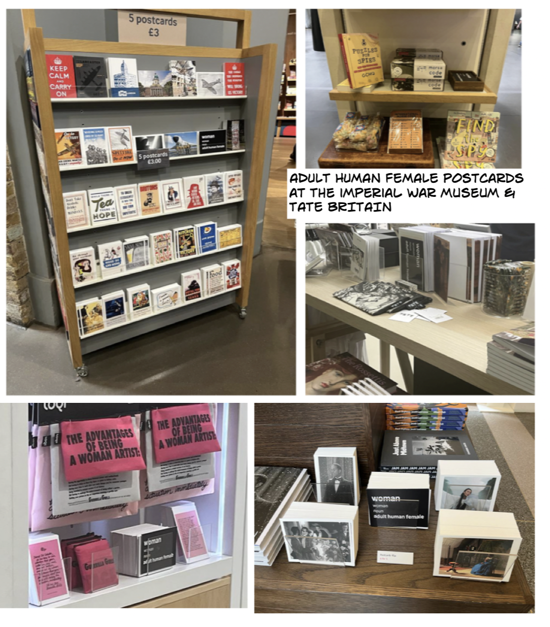 “As two middle-aged white women, the security guards waved us through with no bag check- though finding a large pack of postcards stating the truth that women are adult human females may have caused no alarm. We took the lift for a saunter through the galleries to the upper level shop where I was posting and Sarah was taking the photographs. Discretely, bold as brass and cool as a cucumber, I slipped some single cards into displays where a book was about modern lesbianity (presumably not the dinosaur kind 🙄) or mentioned women artists and then some stacks of 20 or so into their postcard displays.