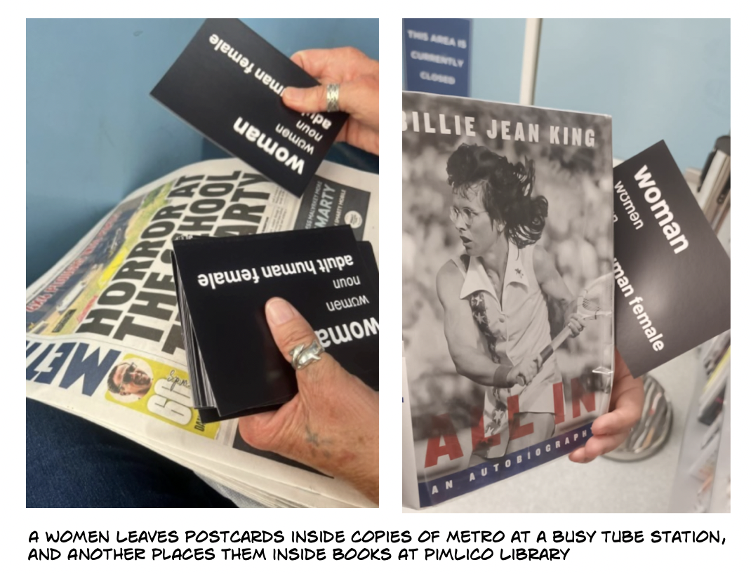 “Who would have thought it would come to this,” writes Carrie, “Women coming together to spread the word, ensuring that the definition of a woman is not eradicated, by leaving ‘reminder’ postcards all around London.