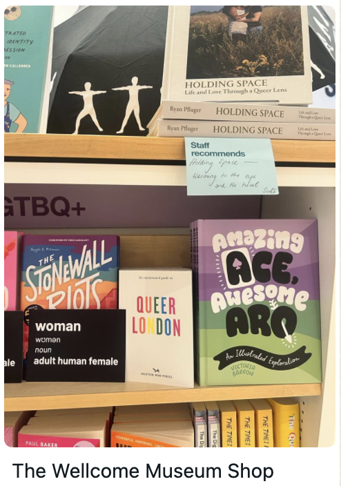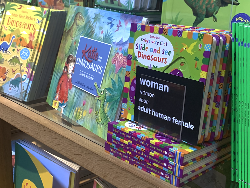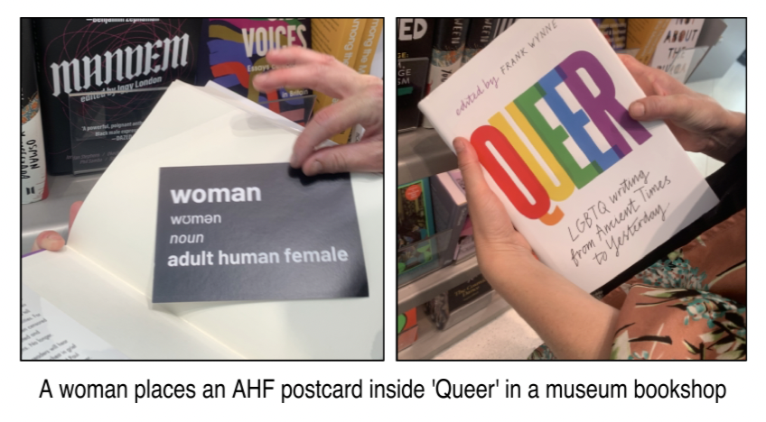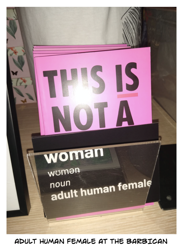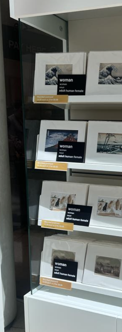 “As two middle-aged white women, the security guards waved us through with no bag check- though finding a large pack of postcards stating the truth that women are adult human females may have caused no alarm. We took the lift for a saunter through the galleries to the upper level shop where I was posting and Sarah was taking the photographs. Discretely, bold as brass and cool as a cucumber, I slipped some single cards into displays where a book was about modern lesbianity (presumably not the dinosaur kind 🙄) or mentioned women artists and then some stacks of 20 or so into their postcard displays.