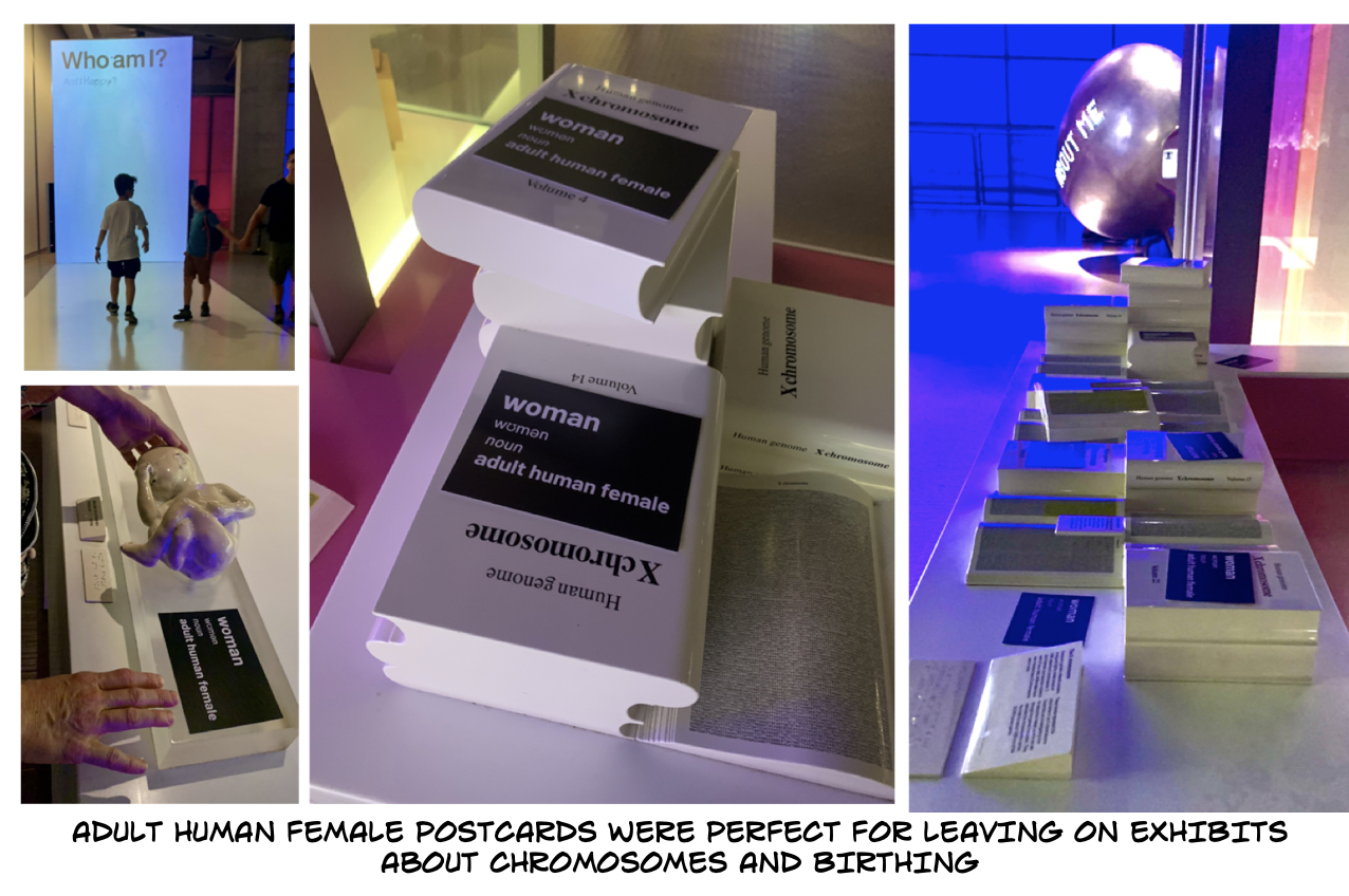 “But that just speaks to where we are in this post-truth world! At the V&A they were very quick to remove our postcards from the postcard racks but at the Science Museum and The Natural History Museum, they stayed up much longer. One of my favourite moments was in the exhibition at the Science Museum (insert name!) It was about human development and when we found an exhibit of piles of large white books called simply “x chromosome” I felt so excited I nearly squealed with delight!