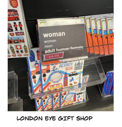 To The Imperial War Museum! Entry shops x 2 and a larger shop in the lower ground were our targets. Here, my favourite spot was The Future is Female display. I expect that when women took over from men doing all the jobs previously done well enough by men, the idea of what future female looked like was very much about the adult human female, not men in lipstick and pornographic style underwear claiming to “feel like women”. I hope the customers interested in a mug, keyring or tote bag appreciated the definition of woman being at hand.