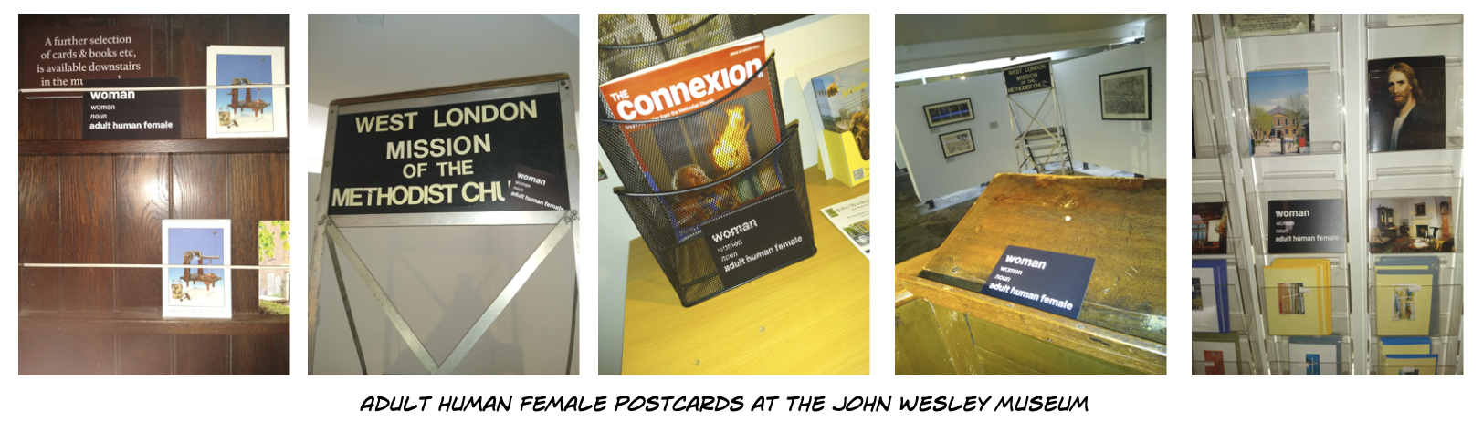 “We started our postcard drop at the John Wesley Museum. Here, we made sure to put an Adult Human Female postcard on display on the metal stand that the preacher used to spread his message at Speaker’s Corner as well as stashing some more on his pulpit and behind greetings cards in the shop.