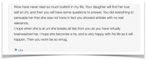 If a child desists and the parent- or even the child themself- speaks out, it is met with denial by the translobby. More often than not the child’s parents are accused of bad parenting or even brainwashing. Here is a recent comment on my article on the 4thwavenow website: