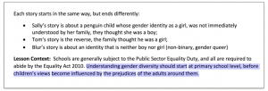 The lesson plans accompanying the books make an (irrelevant) reference to the Equality Act, accompanied by this rather ominous observation:
