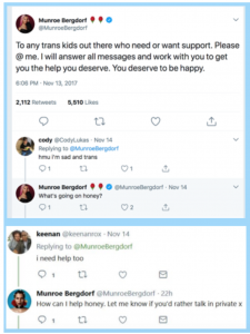 Trans-identified male Munroe Bergdorf- who has undergone breast implants, facial feminisation surgery and says he would, aged 8, have “leapt at the opportunity”to live ‘as a girl’, sent an open message to children on Twitter, telling them to contact him by direct (private) message if they wanted to talk.