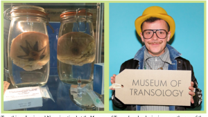 Two things Jessie and Naomi noticed at theMuseum of Transology book signing were the age of the girls present and the self-harming scars borne by so many. Naomi was pretty certain that at 17 she was the eldest and they guessed several to be as young as 13. No parents were in attendance. An anecdote that stuck in my mind was that the curator- a trans-identified woman whose pickled breasts were present in an exhibit jar- at one point got down on her knees, twirly moustache and all, and shuffled across the floor saying, “Trans children! I want to be them!”