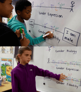 It starts off well, dismissing stereotypes, but soon disintegrates into a scenario where kids in the classroom are encouraged to mark their biological sex on the board and conclude by deciding whether ‘I am female’ or “I am male’, or anywhere in between, along a ‘gender identity’ spectrum.