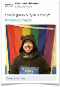 Back to ‘Introducing Teddy‘. Ryan is a trans-identified woman who works for Allsorts and is here dressed as a teddy bear to read Introducing Teddy to a group of 5-11 year olds. When I drew attention to this Tweet, Allsorts promptly removed it.