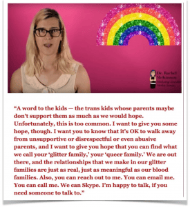 Dr Rachel McKinnon (Philosophy PhD) likes to win women’s cycling races and sent an open message to trans-identified kids on Mothers’ Day 2017 saying they should walk away from ‘unsupportive’ parents and find their ‘glitter family‘.