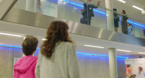 Cut to the pristine glass and neon hospital where Dr Farrell appears like a genie, waving a greeting to Vicky and Max, by a big glass elevator.