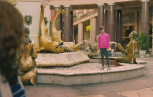 Her phone rings, she throws it to Stephen who answers. Cut to Vicky who hangs up. The camera pans round to focus on Max who is standing by a fountain of cascading water and golden mermaids.