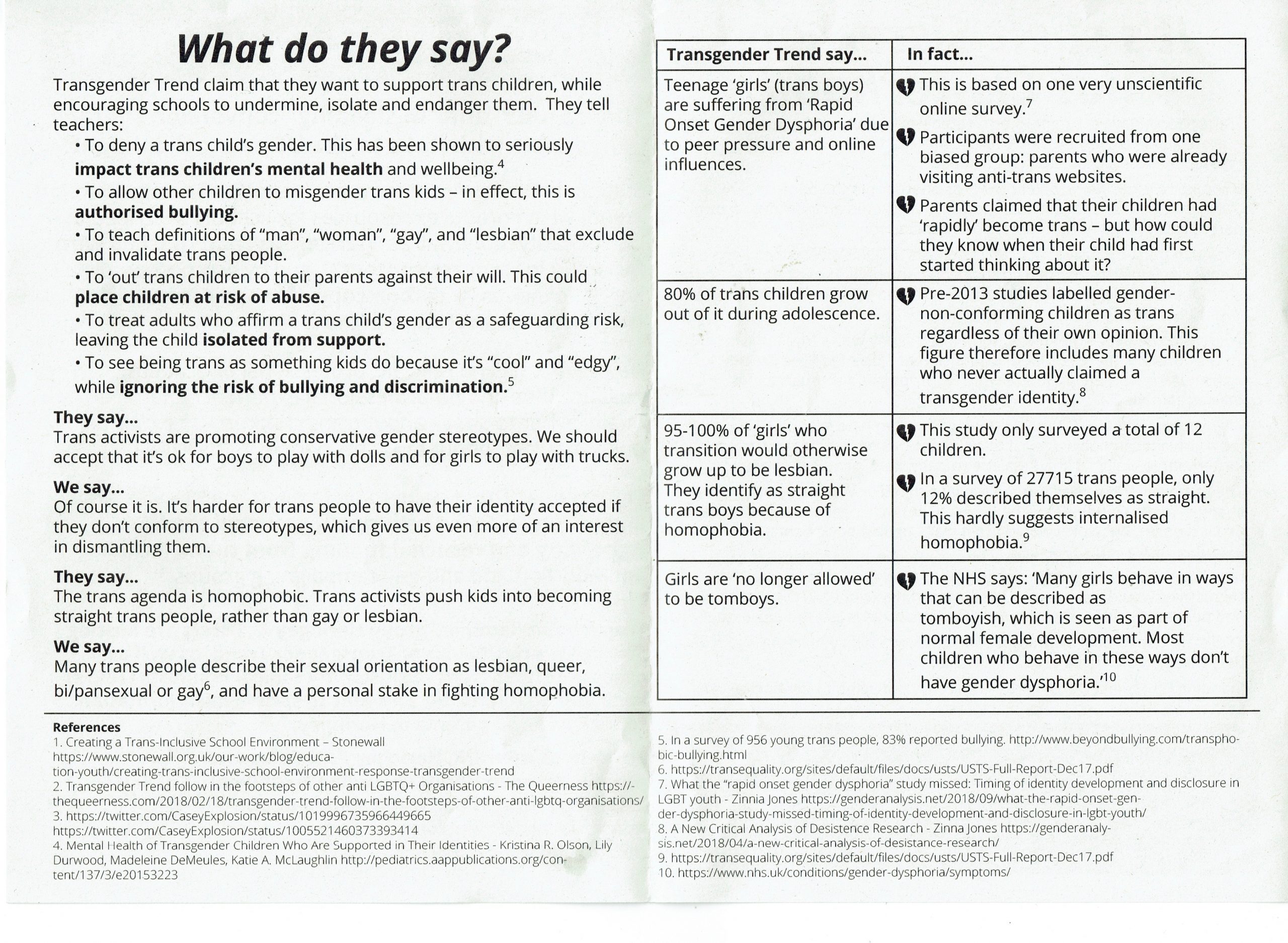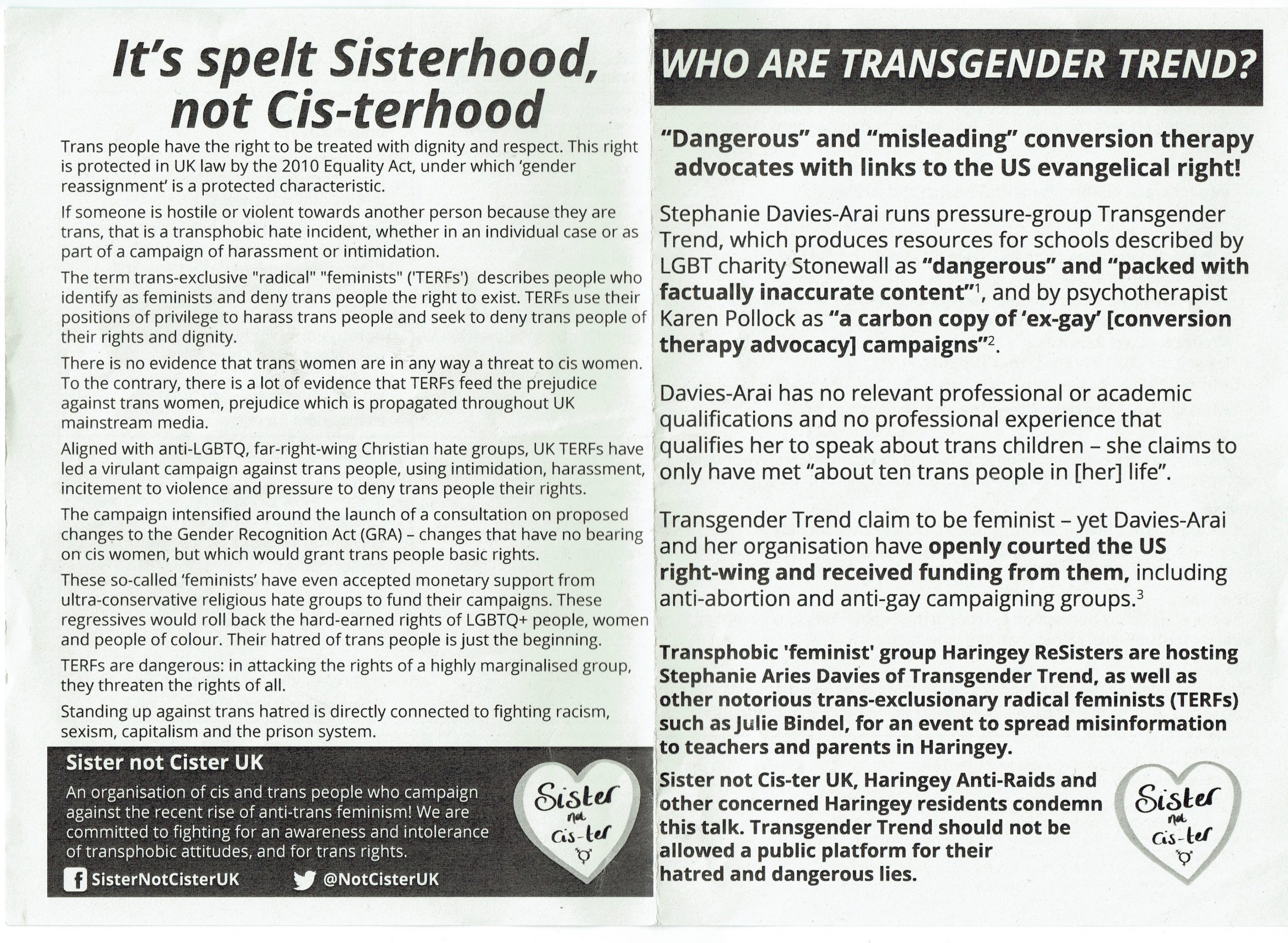 “They’re funded by the far right,” she told me earnestly, handing me a leaflet entitled ‘Who Are Transgender Trend? “Dangerous” and “misleading” conversion therapy advocates with links to the US Evangelical right!”