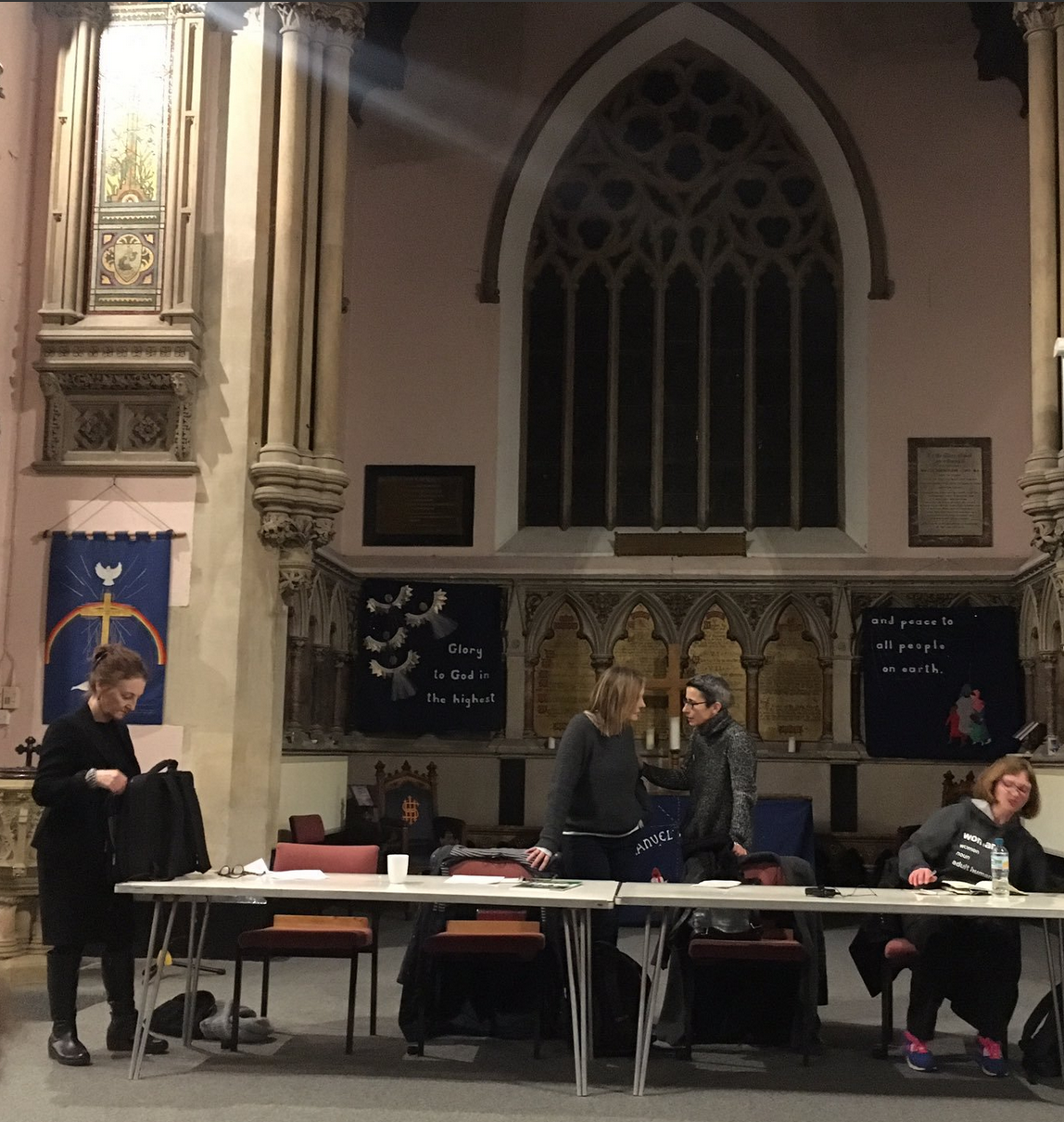 Arriving on a quiet, leafy and dimly-lit residential street, I thought we might have taken a wrong turning. Then I saw a church spire rising up above the trees. Intricate stained-glass windows splashed colour back onto the dark street. We passed through an iron gate and under a white stone arch, where we were welcomed to the meeting by women from Haringey ReSisters. Although not as august a venue as St Mary le Bow, where I had attended the Let a Woman Speak meeting back in November, the church was impressive. (Both Let A Woman Speak and Haringey ReSisters are secular organisations; the meetings just happened to be in churches, partly because of the difficulty of finding a venue that won’t be intimidated into cancellation.) The temperature was unsurprisingly much warmer inside the building. I took off my coat and put it over the back of a well-positioned chair, milling around and talking to a couple of women I had met elsewhere, before going outside again with Emma, who wanted a quick cigarette before the talks began.