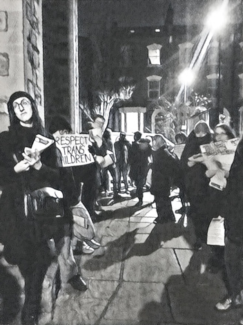 As I left the meeting I saw Venice talking to some of the transactivists outside and filming the exchanges on her phone. There seemed to be a few more than there had been at the start.