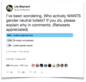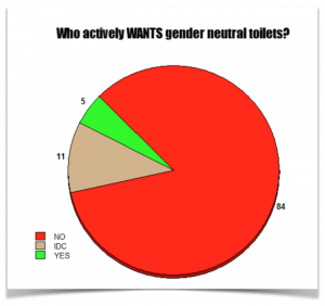 Checking with other polls and surveys, it seems that Loose Women understands the situation very well. I’m not alone with finding unenthusiastic results. When Channel 4 unveiled its new gender neutral (GN) toilets ‘4everyone’, women were not impressed, leading the Express newspaper to run its own readers’ poll in which a whopping 92% of people replied that men and women should not be expected to share toilets. When Irish broadcaster Claire Byrne ran a similar poll, only 31% of respondents voted in favour of GN toilets.