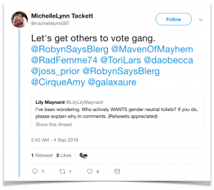 I tried to partly redress this balance by asking people to retweet; wording the poll to appeal specifically to those who might actively want gender neutral bathrooms, and only asking those who favoured them to give their reasons for the preference. My poll was shared 255 times and  although I have no way of tracking who shared it with whom, I do know it also reached the trans community: for example Michelle, ‘a loveable trans woman who loves God,’-  who later that week DMd me to call me a ‘pathetic vile bigot’-  shared the poll with his followers, although with limited success.