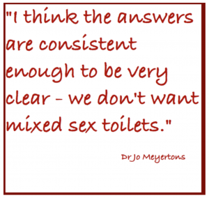 I think the answers are consistent enough to be very clear – we don’t want mixed sex toilets.” said Dr Jo Meyertons, going on to add, “Only trans-id males want them, and they don’t give a damn about women or girls.”
