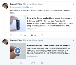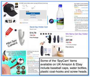 Think it doesn’t happen here? Here are just some of the SpyCam items available on UK Amazon and Ebay. A baseball hat with a camera in the front will cost you £55. A fake water bottle is a snip at a mere £32. You can buy a plastic coat hook with a hidden camera in it for less than £15. One UK seller among many has sold 53, has more than 10 more available and boasts 100% customer satisfaction. At the time of writing, 43 people are ‘watching’ the item on Ebay.