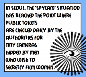 The use of SpyCams. Also known as Molka. Recently I was contacted by a woman via Twitter. She lives in Korea, where women are frequently filmed without their knowledge and the results posted on the internet, sometimes by boyfriends but often by strangers. The results can ruin women’s lives.