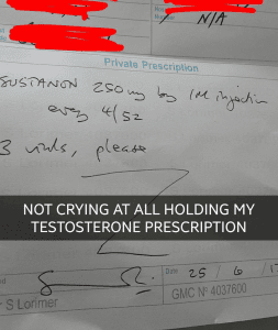 After a first GenderCare appointment: “NHS was no longer an option for me… so I paid to go and see Dr Seal to assess me and diagnose me with gender dysphoria… if you’re like me and you didn’t know you were trans at the age of six don’t worry, he’s not there to judge you. I was so nervous, I had butterflies, I felt sick… but super-excited… after it I felt so happy, he diagnosed me with gender dysphoria, he said I could start T and I had to wait 2 weeks to start it. I was over the moon. I felt my life was finally going to start…”