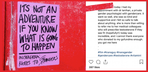 Instagram posts with the hashtag #gendercare contain pictures like this one, a prescription for testosterone prescribed by Lorimer, accompanied by cheers of ‘well done bro’ and ‘yay congrats’.