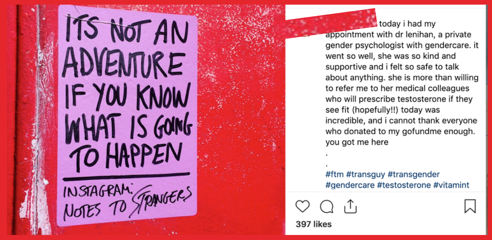 “It’s not an adventure if you know what is going to happen” posts one young client after a ‘gofundme’ paid for her appointment with GenderCare.