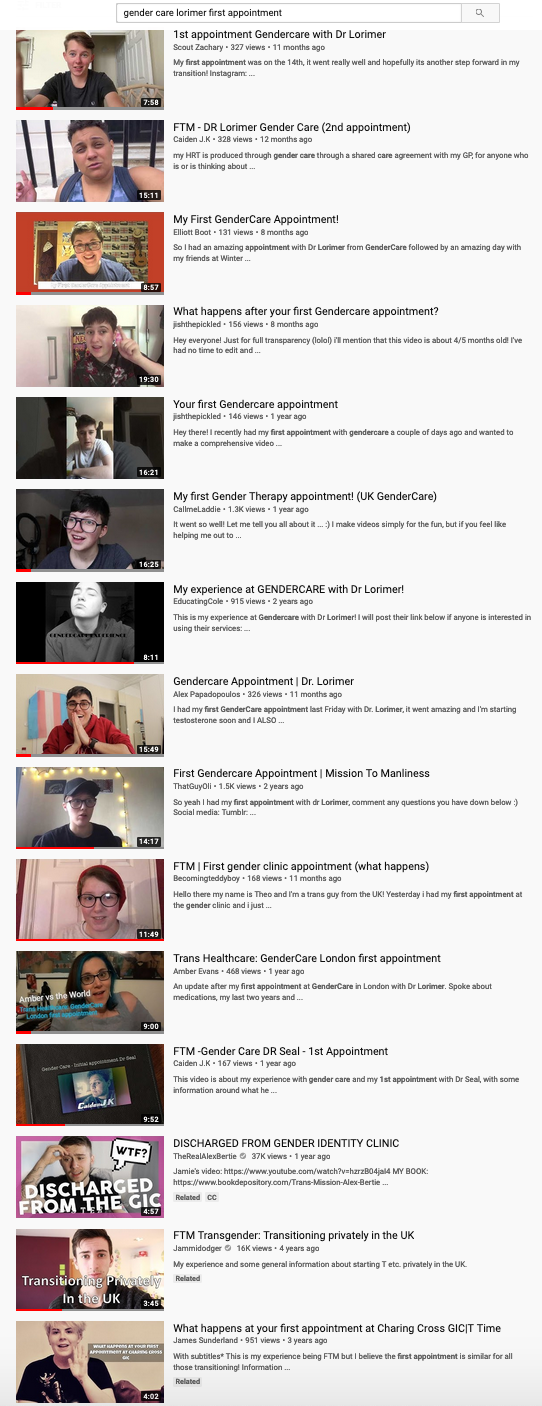 What did I learn from my day of watching these videos? Well, as customers they invariably seem to be dealt with remarkably quickly by GenderCare, receiving prescriptions for testosterone following first and second appointments.