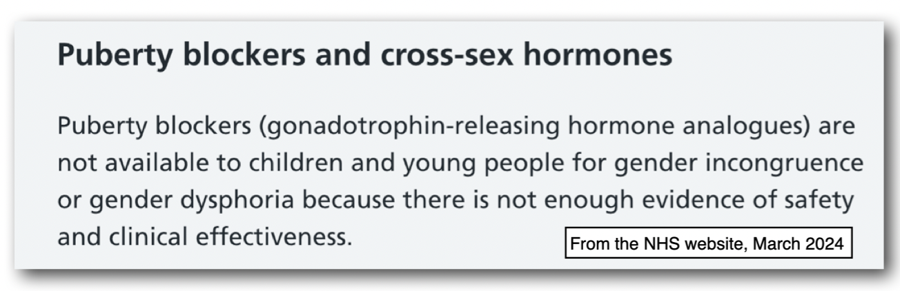 In 2018, the NHS was asserting “the effects of treatment with GnRH analogues (aka ‘puberty blockers) are considered to be fully reversible”.