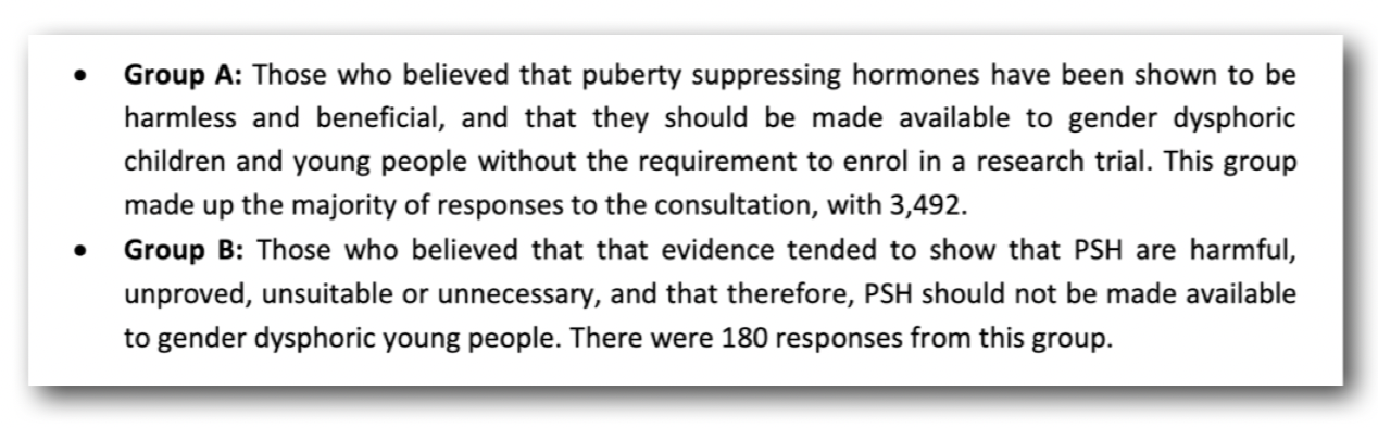 “We consider the risks of PSH used off-label for children too great to justify a clinical trial. We believe it is unethical to prevent a child’s natural pubertal development into adulthood, unless there are exceptional reasons for doing so, for example if the child’s condition is life-threatening. There is no evidence that medically preventing a child’s puberty is ‘lifesaving care’.”