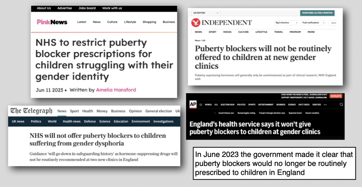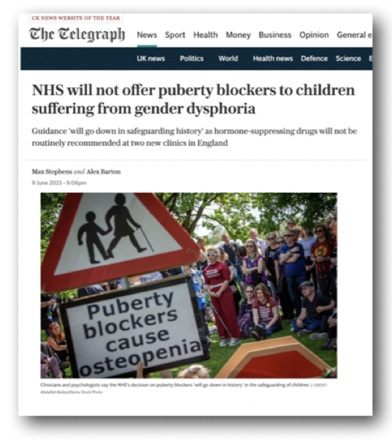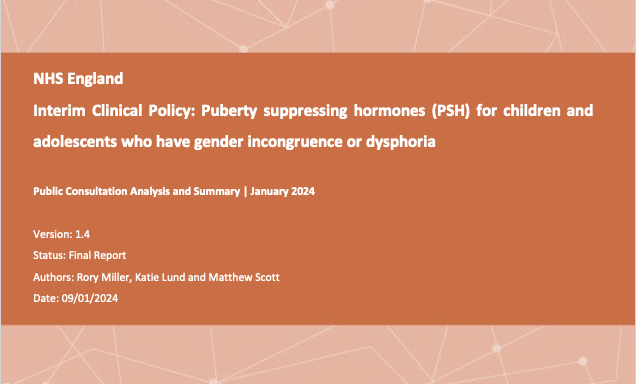 In June 2023 the NHS announced that following “advice from Dr Hilary Cass’ Independent Review highlighting the significant uncertainties surrounding the use of hormone treatments” they wished to make clear “that the NHS will only commission puberty supressing hormones as part of clinical research.”