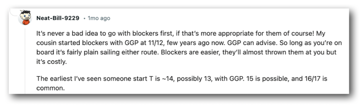 A trip to Reddit threw up a post ostensibly from a woman wanting to get hormones for her child from GenderGP. The post received, among others, this response claiming that getting blockers for 12 year olds from GGP is ‘plain sailing’ and that ‘they’ll practically throw them at you.”