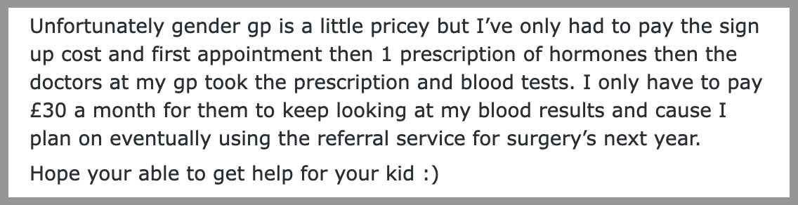 Another GGP user on the Reddit thread above explains how they did just that- got one private prescription of hormones from GGP before transfering onto the NHS via their own doctor.