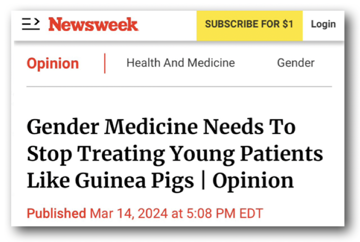 In Newsweek, the Alliance Defending Freedom demands ‘Gender Medicine needs to stop treating young patients like guinea pigs’.