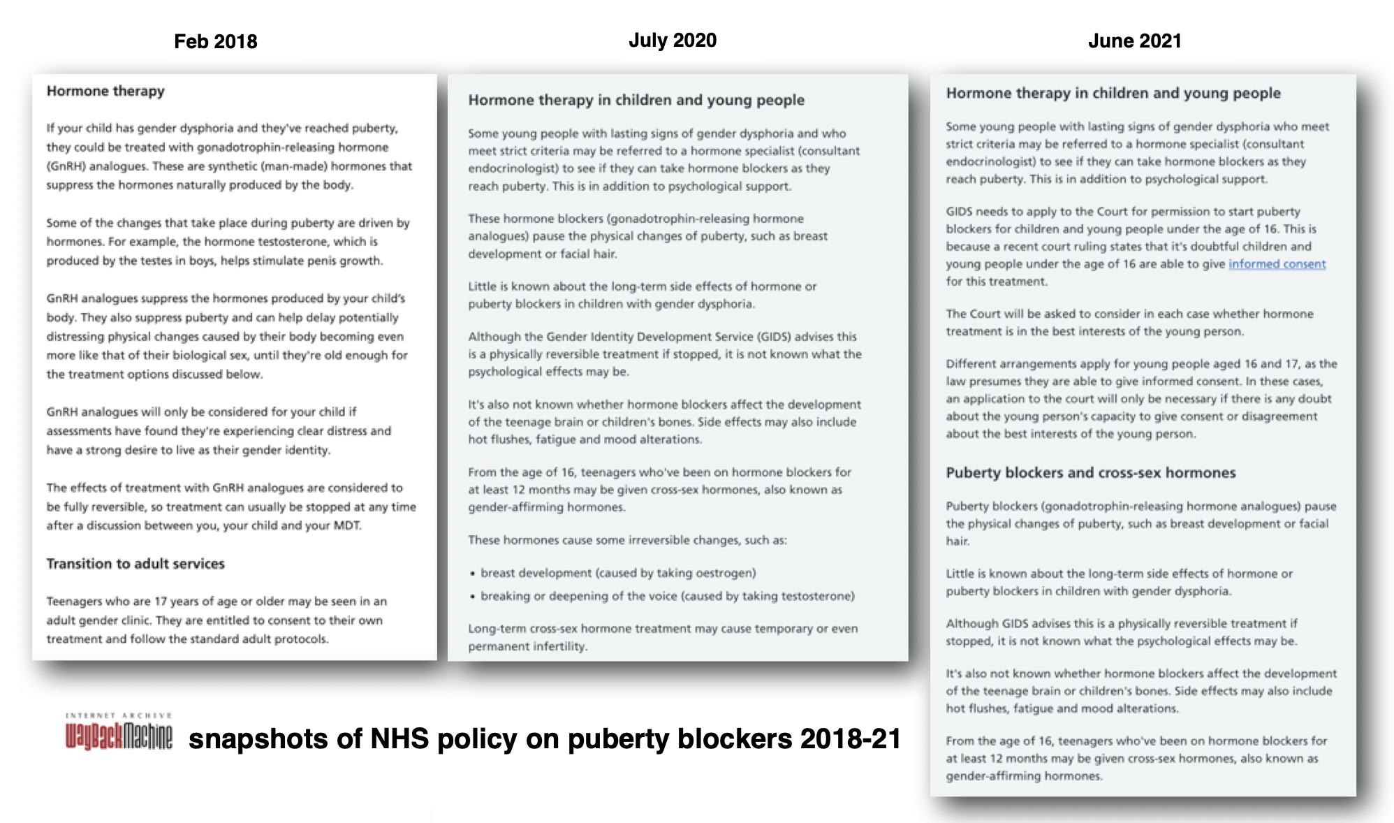 I visited Wayback Machine to collect snapshots of the ever-changing NHS policy on giving blockers and cross-sex hormones to children. Snapshots from the NHS page on gender dysphoria from Feb 2018, July 2020 and June 2021 are below.