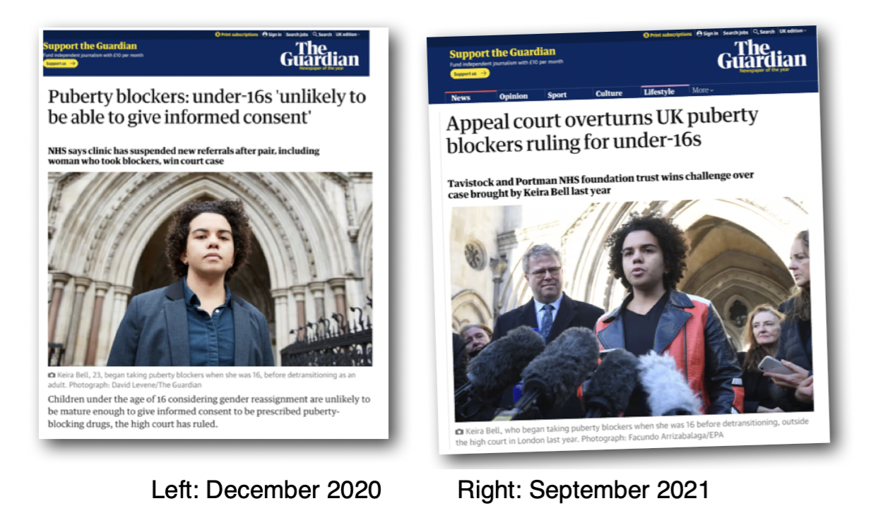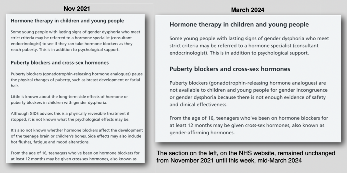 In 2021 the same warnings were present on the NHS website, until June, after the court ruling, when the page was changed: “GIDS needs to apply to the court for permission to start puberty blockers… a recent court ruling states that it is doubtful that children and young people under the age of sixteen are able to give informed consent”.