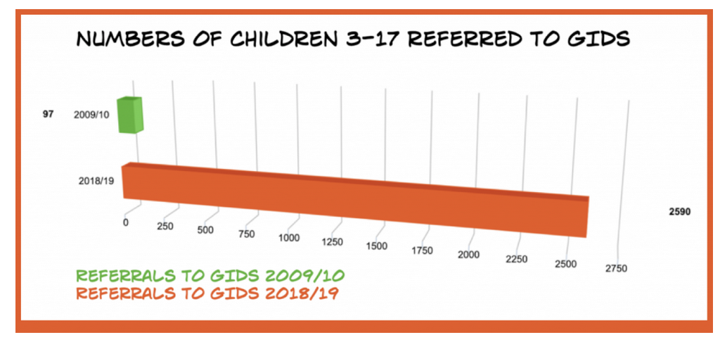 In 2019, five clinicians whjo had resigned from GIDS due to concerns spoke to the Times, which reported: “There used to be about 50 referrals (to GIDS) a year, mainly males with a history of gender issues. Now there are thousands of young females reporting a sudden gender crisis for the first time.”