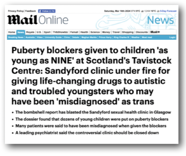 After a Daily Mail report in 2022, that the Sandyford Clinic in Glasgow was prescribing blockers to children as young as nine, there were calls for the clinic to be closed. This has not happened.